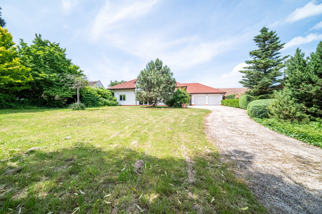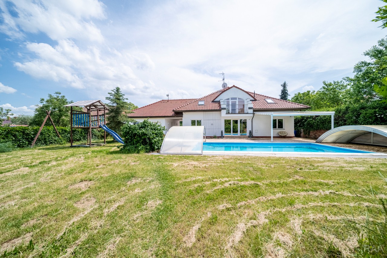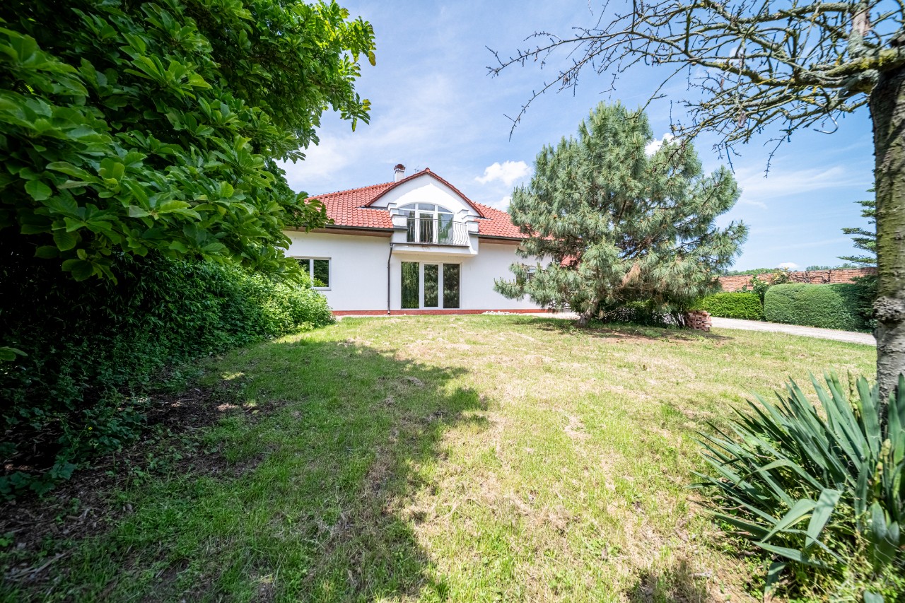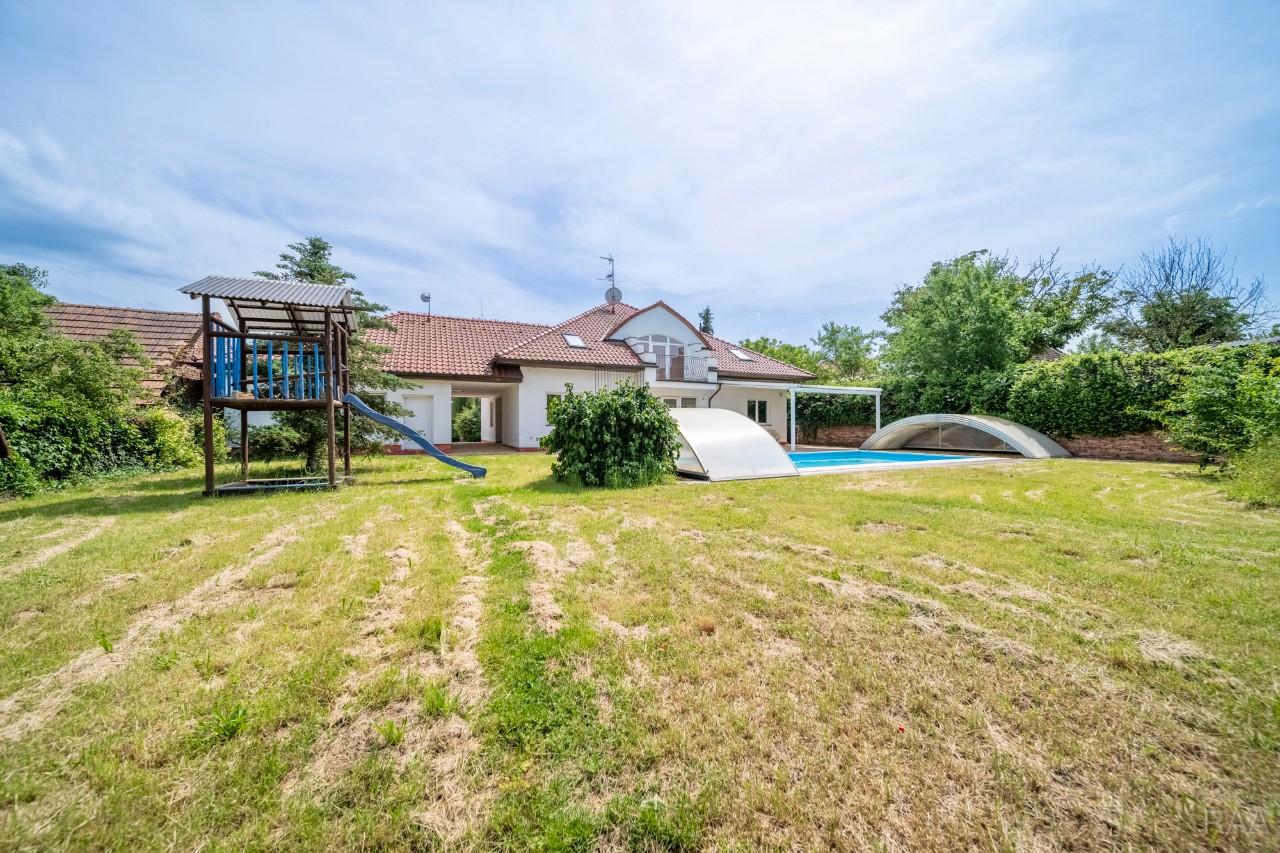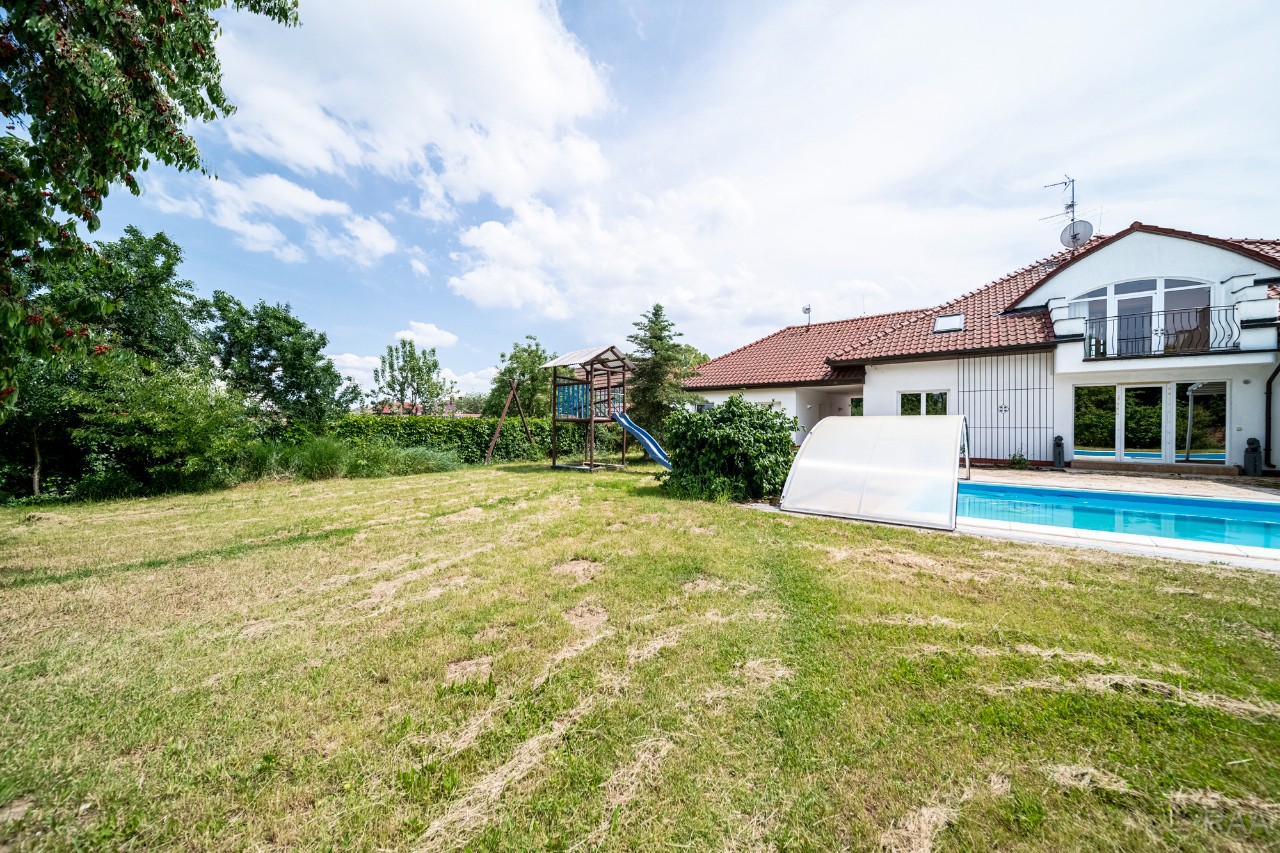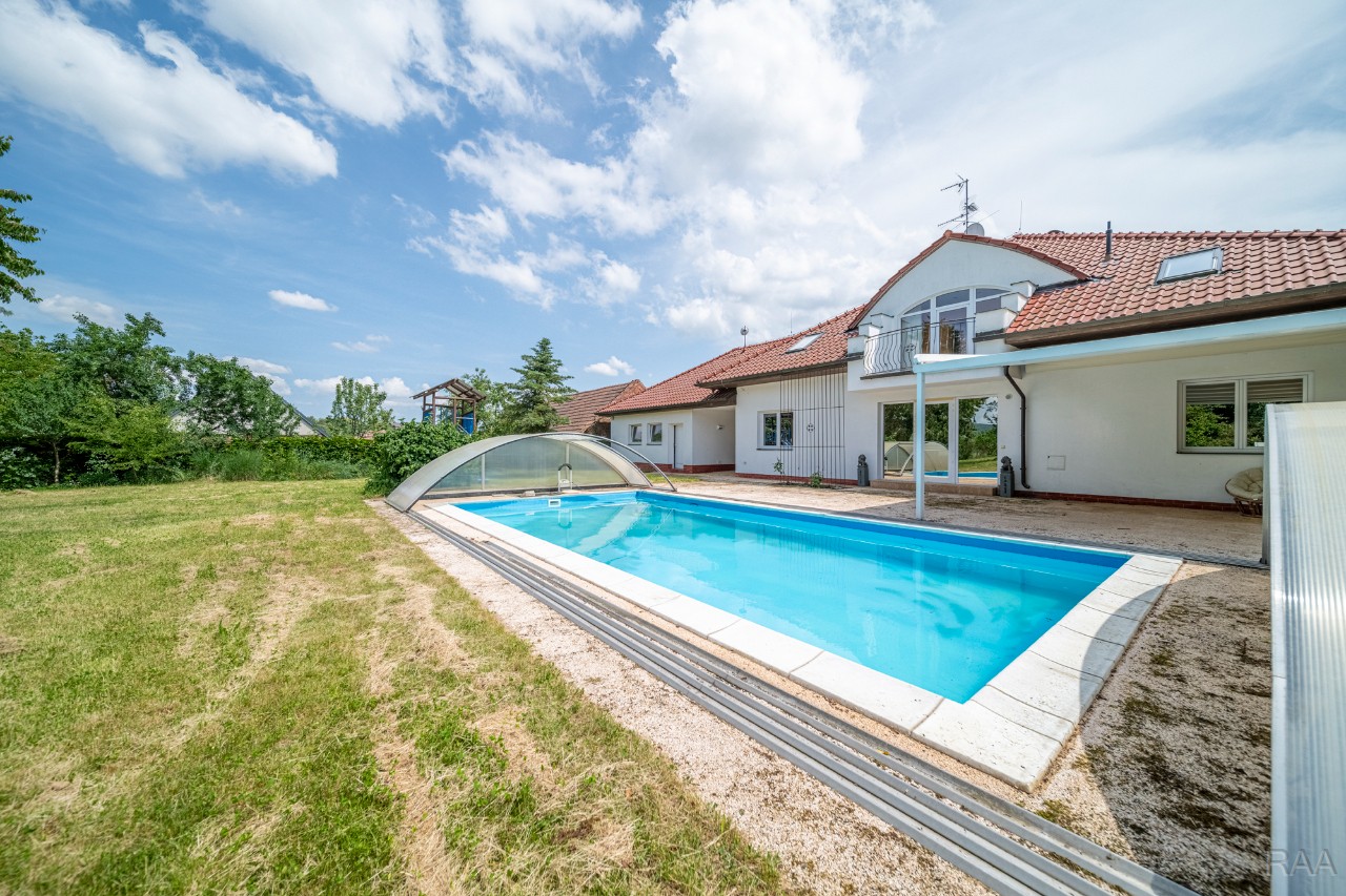 Prodej nadstandardního rodinného domu v obci Kudlovice (cca 9km vzdáleno od Uherského Hradiště, cca 11 minut po dálnici D55). Pozemek celkem 2545m². Užitná plocha domu 250m². Venkovní zastřešený bazén s filtrací má rozměry šířka 5m x délka 10m x hloubka 1,6m, zastřešení je zasouvatelné. Dům je ideálním útočištěm pro ty, kdo hledají klid a bezpečí - od ulice jej chrání masivní zídka, která zajišťuje naprosté soukromí a chrání pozemek před pohledy zvenčí. Příjezd k domu po obecní asfaltové silnici. Napojeno na všechny inženýrské sítě: elektřina, vodovod, kanalizace, plyn. Vytápění plynovým kotlem se zásobníkovým ohřívačem teplé vody. Dům je jednopodlažní, nepodsklepený s obytným podkrovím. Základy železobetonové pasy, svislé nosné a obvodové stěny betonové systému ztraceného bednění VELOX, z exteriéru opatřeno kontaktním zateplovacím systémem, vnitřní příčky z plynosilikátu YTONG, zastřešení glazovanými keramickými taškami, klempířské prvky z mědi, na střeše osazen bleskosvod. Podlahy keramické dlažby, v 2. NP (podkroví) plovoucí podlahy. Venkovní okna a dveře plastová s termoizolačním dvojsklem. Vnitřní dispozice: 1.NP (přízemí): garáž pro 2 os. automobily, technická místnost, vstup do domu, obytný prostor s krbem a centrálním schodištěm do patra, kuchyně s jídelním koutem, pracovna, pokoj, koupelna s rohovou vanou a sprchovým koutem, samostatné WC; 2.NP (podkroví): schodišťový prostor, 3x pokoj, koupelna, 2x terasa, 2x šatna, půdní prostory. Kolem domu je okrasná udržovaná zahrada se vzrostlými stromy. Vstup na pozemek z ulice přes portál s brankou a automatickou vjezdovou bránou, přičemž portál je umístěný v zídce o výšce 2,2m, uliční šířka pozemku 23m. Vše funkční a ve výborném stavu, výstavba v r. 2004. Volné ihned.