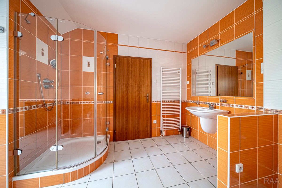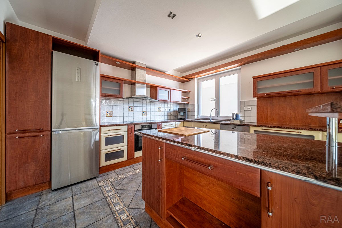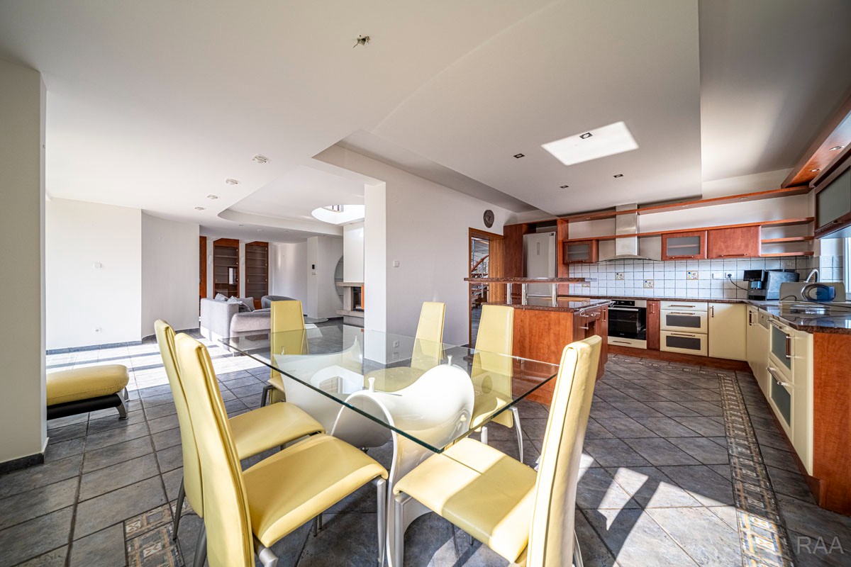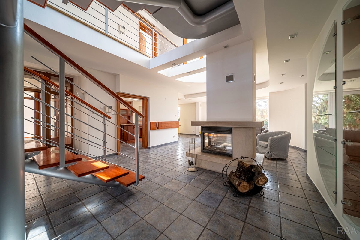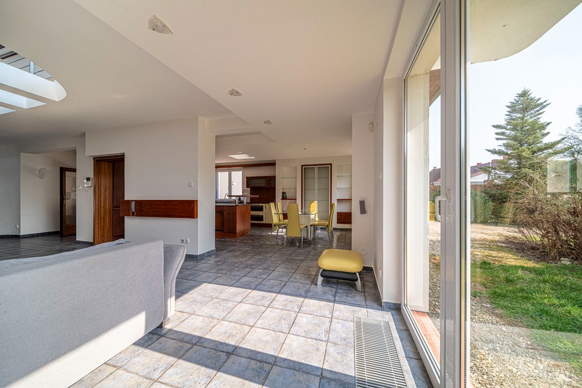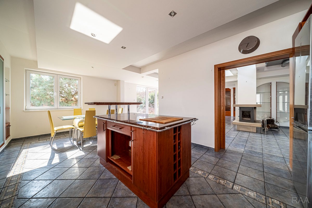 Prodej nadstandardního rodinného domu v obci Kudlovice (cca 9km vzdáleno od Uherského Hradiště, cca 11 minut po dálnici D55). Pozemek celkem 2545m². Užitná plocha domu 250m². Venkovní zastřešený bazén s filtrací má rozměry šířka 5m x délka 10m x hloubka 1,6m, zastřešení je zasouvatelné. Dům je ideálním útočištěm pro ty, kdo hledají klid a bezpečí - od ulice jej chrání masivní zídka, která zajišťuje naprosté soukromí a chrání pozemek před pohledy zvenčí. Příjezd k domu po obecní asfaltové silnici. Napojeno na všechny inženýrské sítě: elektřina, vodovod, kanalizace, plyn. Vytápění plynovým kotlem se zásobníkovým ohřívačem teplé vody. Dům je jednopodlažní, nepodsklepený s obytným podkrovím. Základy železobetonové pasy, svislé nosné a obvodové stěny betonové systému ztraceného bednění VELOX, z exteriéru opatřeno kontaktním zateplovacím systémem, vnitřní příčky z plynosilikátu YTONG, zastřešení glazovanými keramickými taškami, klempířské prvky z mědi, na střeše osazen bleskosvod. Podlahy keramické dlažby, v 2. NP (podkroví) plovoucí podlahy. Venkovní okna a dveře plastová s termoizolačním dvojsklem. Vnitřní dispozice: 1.NP (přízemí): garáž pro 2 os. automobily, technická místnost, vstup do domu, obytný prostor s krbem a centrálním schodištěm do patra, kuchyně s jídelním koutem, pracovna, pokoj, koupelna s rohovou vanou a sprchovým koutem, samostatné WC; 2.NP (podkroví): schodišťový prostor, 3x pokoj, koupelna, 2x terasa, 2x šatna, půdní prostory. Kolem domu je okrasná udržovaná zahrada se vzrostlými stromy. Vstup na pozemek z ulice přes portál s brankou a automatickou vjezdovou bránou, přičemž portál je umístěný v zídce o výšce 2,2m, uliční šířka pozemku 23m. Vše funkční a ve výborném stavu, výstavba v r. 2004. Volné ihned.